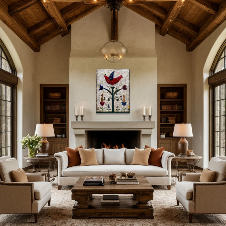 В дизайне интерьера в русском стиле живопись перестает быть просто украшением. Она становится смысловым и эмоциональным центром. Что ищет взгляд, когда хочет отдохнуть в уютном загородном доме? Тишину, приглушенный цвет старого дерева, мягкий контур, намек на сказку. Именно эти ощущения дарит наивное искусство. Оно не требует сложной интеллектуальной расшифровки — оно обращается напрямую к чувствам, создавая тот самый уют в загородном доме, который невозможно сымитировать дорогим текстилем.