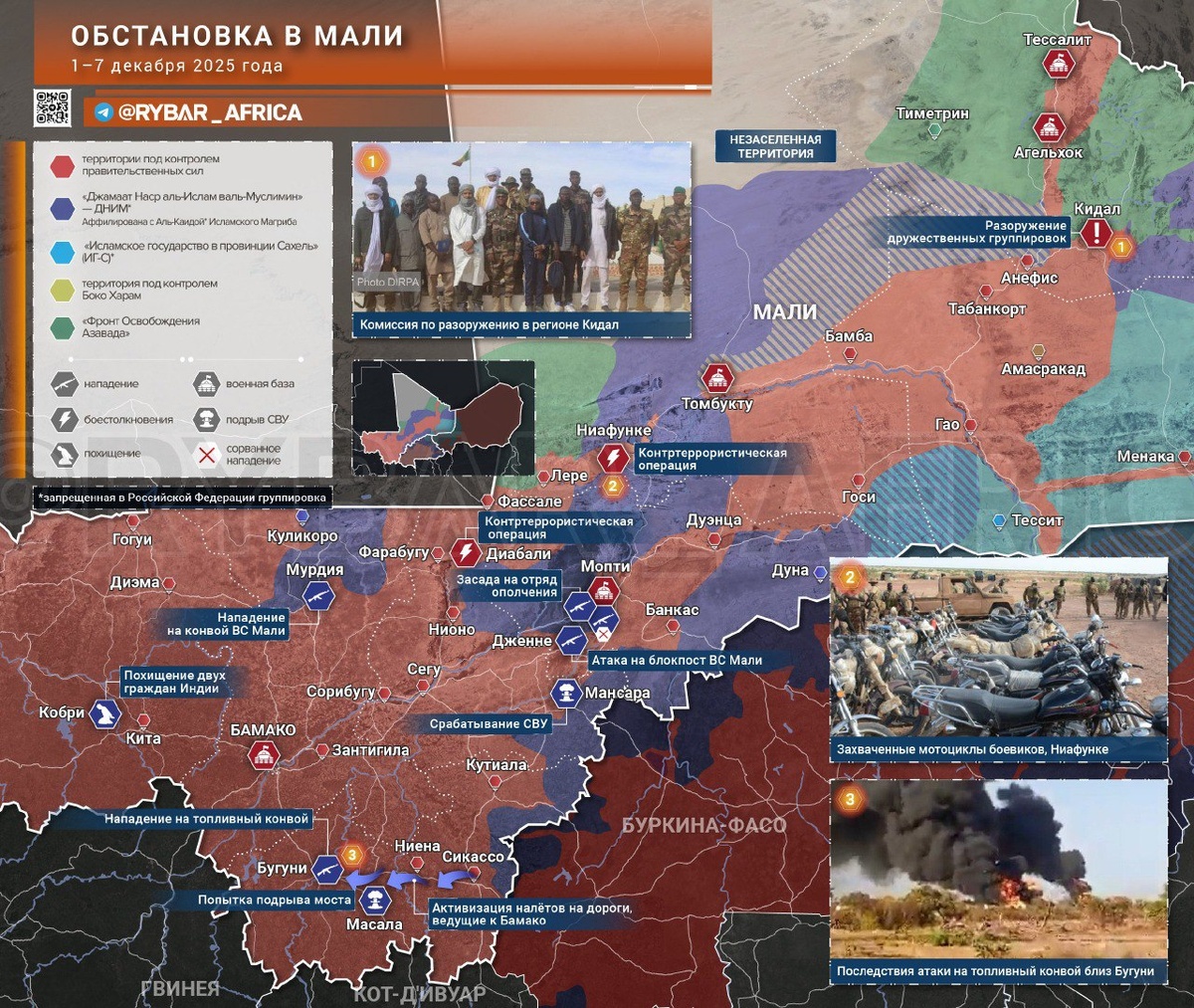 После масштабных атак на коммуникации малийские вооруженные силы наконец-то стали наращивать интенсивность и географию операций против антиправительственных группировок. 🔸Прошли успешные мероприятия по ликвидации боевиков «Джамаат Нусрат аль-Ислам валь-Муслимин» близ Ниафунке и Диабали. Также целью рейдов все чаще оказываются именно лагеря и импровизированные склады. 🔸Боевики по прежнему активны на юге в регионе Сикассо. Но попытка повторить наиболее тяжёлую фазу топливной блокады приводит к рассредоточению сил со всеми вытекающими. Хотя пожары в конвоях с горючим по-прежнему вспыхивают. 🔸А на севере власти занимаются разоружением ранее дружественных группировок с целью положить конец «махновщине» и полноценно включить их в состав ВС. Масштабы и эффективность мероприятий, впрочем, пока не стоит переоценивать. В дальнейшем логичным направлением операций стали бы рейды для уничтожения баз в регионах Мопти и Сегу с целью снизить возможности действий боевиков из буркинийского пригранич