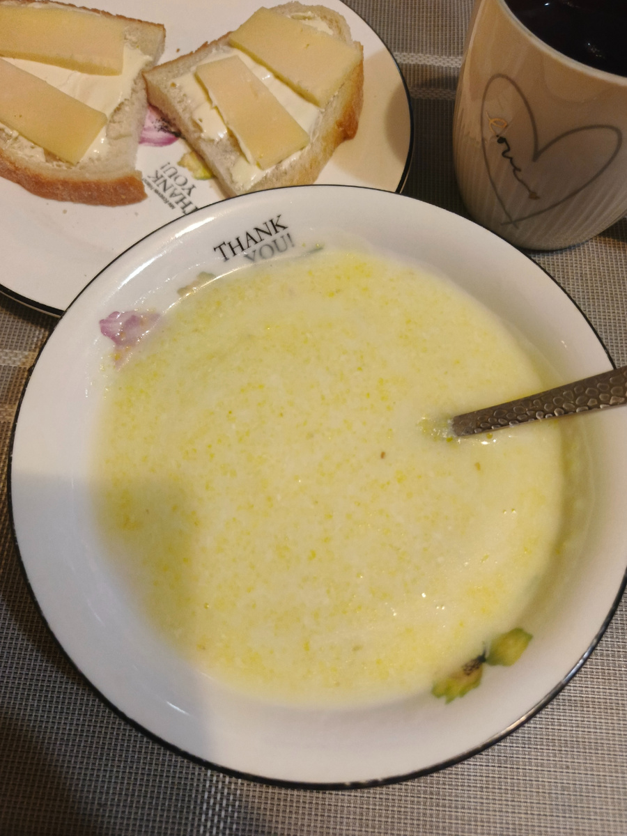 Здравствуйте! А как еще назвать понедельник? Сегодня у нас выпал снежок. так, для вида, но все равно приятно. Возможно, он останется с нами на всю зиму, но это не точно. Как у вас дела с подарками? Я еще только собираюсь с мыслями, силами и деньгами. Чувствую, что нужно очень многим купить подарки, у меня только крестников трое. Да еще и вся семья "зимняя", дни рождения у нас подряд, тоже нужно подумать. Сын запросил ноутбук, смотрим в этом направлении. Я сама Новый год не люблю. Давно. Но без подарков, конечно, своих не оставлю. Теперь покажу, что готовила. Продолжаю осваивать кукурузную кашу. Помню, что когда сын был маленький, у нас была крупа более крупного помола. Эта же достаточно мелкая, быстро начинает собираться в комочки. Тем не менее, на этот раз мне удалось сварить из нее сносную молочную кашу, которую дополнила бутербродами. На обед приготовила щи на свиных ребрышках с квашеной капустой. Все со свежей и свежей, захотелось, наконец, уже использовать квашеную. Раньше я щ