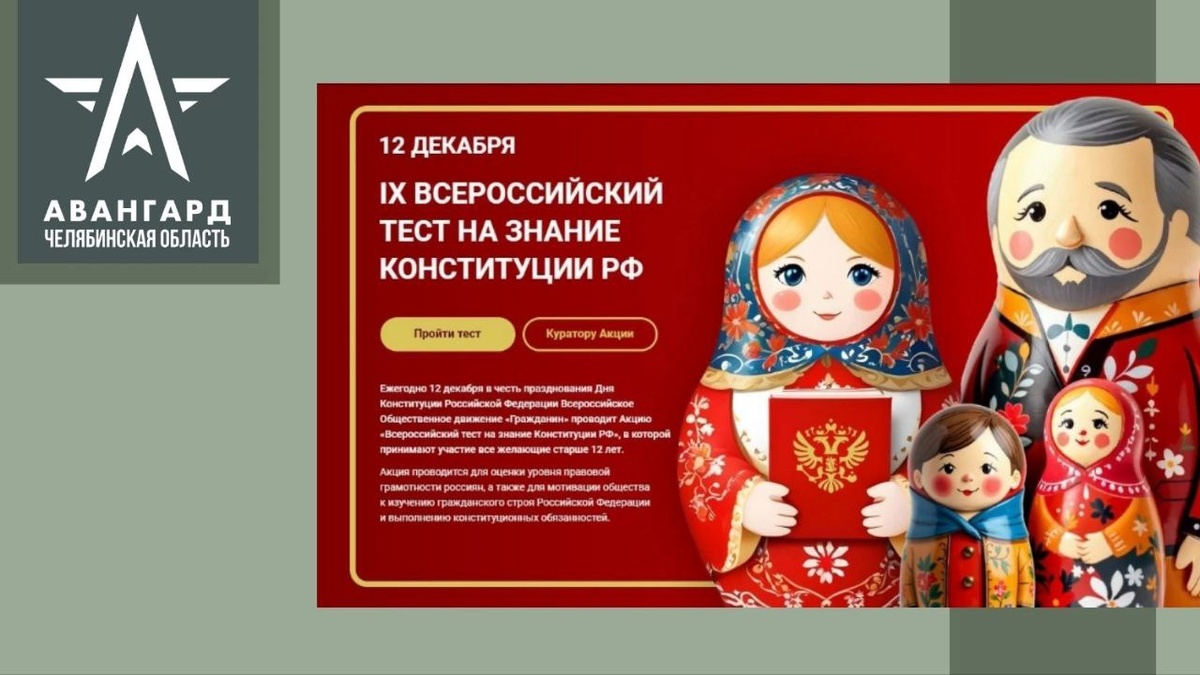 Уважаемые коллеги! Ежегодно 12 декабря в честь празднования Дня Конституции Российской Федерации Всероссийское Общественное движение «Гражданин» проводит Акцию «Всероссийский тест на знание Конституции РФ», в которой принимают участие все желающие старше 12 лет. Акция проводится для оценки уровня правовой грамотности россиян, а также для мотивации общества к изучению гражданского строя Российской Федерации и выполнению конституционных обязанностей. Пройти тест можно здесь: xn--80aahfjo8abu.xn--d1acj3b/test_konst/ К слову, Центр "Авангард" также станет площадкой для проведения данного тестирования. 👌😎