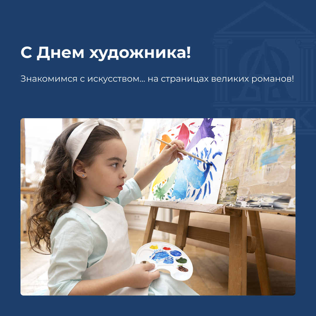 8 декабря во всем мире отмечается Международный день художника — праздник, учрежденный Международной Ассоциацией «Искусство народов мира». От всей души поздравляем всех, чья жизнь связана с творчеством, и тех, кто только мечтает освоить это искусство! А знаете ли вы, что о великих художниках можно узнать не только по музейным табличкам или из энциклопедий? Многие писатели передавали их творчество в сюжетах своих произведений, оживляя полотна словами. ✨ Теодор Драйзер в романе «Гений» описывает, как главный герой, художник Юджин Витла, был потрясен батальными работами Василия Верещагина. ✨ Александр Пушкин посвятил стихотворение живописцу Оресту Кипренскому, который создал его знаменитый портрет. ✨ У Федора Достоевского в «Идиоте» князь Мышкин и Парфен Рогожин горячо обсуждают картину Ганса Гольбейна Младшего. ✨ В повести Антона Чехова «Три года» героиня рассматривает пейзаж, напоминающий «Тихую обитель» Исаака Левитана. ✨ А Марсель Пруст в «Поисках утраченного времени» обращается к об
