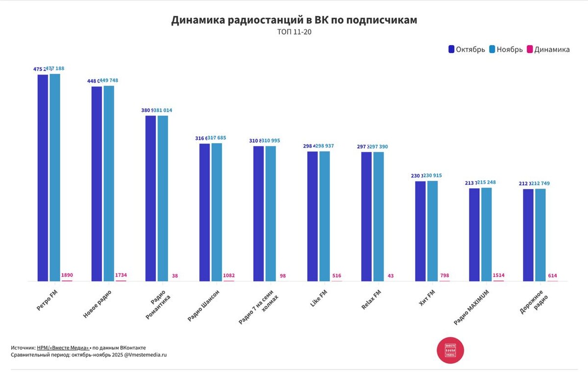 ➡️ Лидер по пр приросту подписчиков за ноябрь — Авторадио 📈+3 010