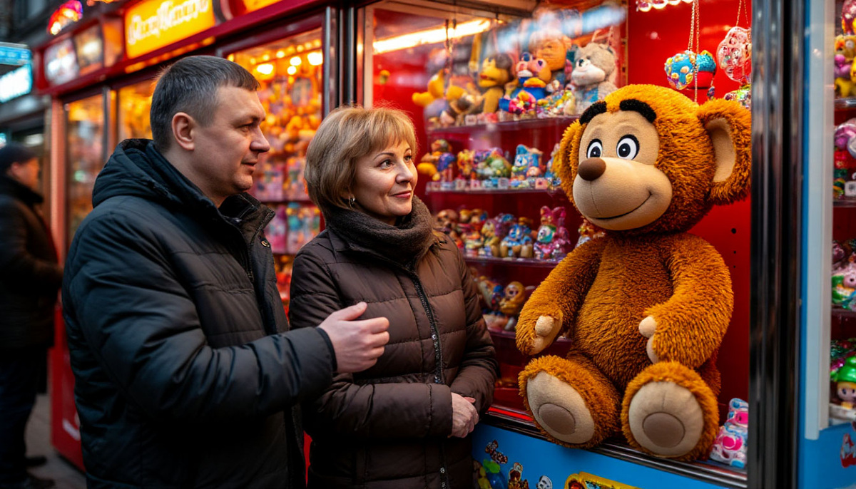 Отчаяние начало сгущаться, как питерские сумерки, когда они увидели Его. У входа в гигантский детский универмаг стоял архаичный, поблёскивающий жёлтыми огоньками автомат. За стеклом, среди прочего пластикового счастья, сидел он. Скромный Чебурашка, плюшевый, с коричневыми ушами и большими глазами, полными экзистенциальной тоски узника.