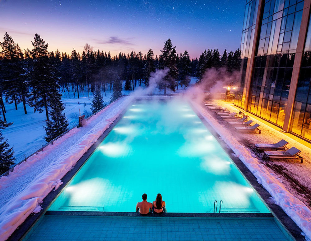 Представьте картину, как вы погружаетесь в теплую морскую воду открытого бассейна, когда вокруг вас зимний лес, кристально чистый воздух и звездное небо. Термальная вода и панорамный вид на природу создают ощущение полного уединения от городской суеты.