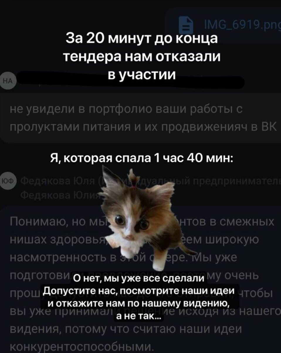 ✅Сегодня отправили еще одно тендерное предложение (2/5) Делать его начали сильно заранее, но потом вдохновение покинуло меня и завершали большую половину презентации мы (конечно же) в ночь перед дедлайном! Потому что во мне очень долго боролись: 1) желание вести большой проект, интересные идеи и концепты, ностальгия по кейс-чемпионатам 2) сомнения, что нас не выберут, потому что мы ноунэймы, «у нас нет кейсов в этой нише», «трачу время впустую», «там наверно взрослые и серьезные дядечки, мы для них не серьезные, нам не доверят» А как бы запрос там был: анализ рынка, анализ конкурентов, концепт стратегии, примеры визуала, написать примеры постов, сделать примеры рилсов, расписать бюджет и kpi, предложить дополнительные варианты продвижения И это очень большой объем работы с эмоциональным вовлечением и вообще без гарантий, что с тобой дальше будут разговаривать! Поэтому чувство такое, что ты просто тратишь время, но вроде уже начали и реально хорошие идеи разработали… а может они вы