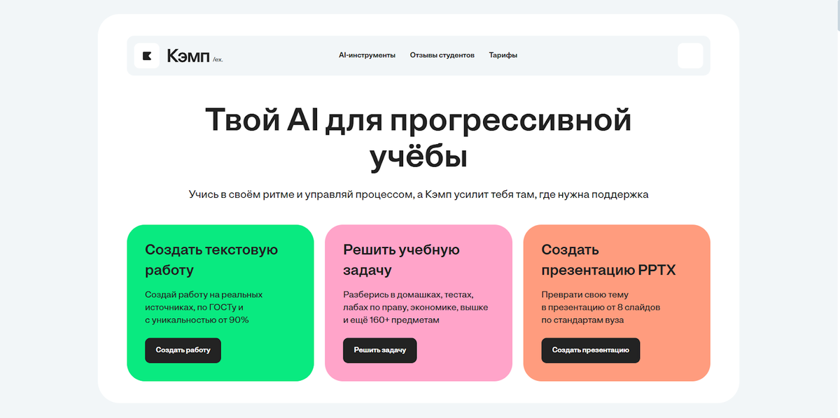 - Кэмп — универсальный помощник для ВКР: генерация текста по ГОСТу, подбор источников и подготовка презентаций; есть бесплатный тест и недорогие разовые работы.