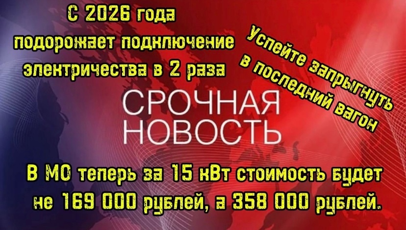 С 2026 года вырастет тариф на подключение электричества к земельному участку в 2 раза‼️
