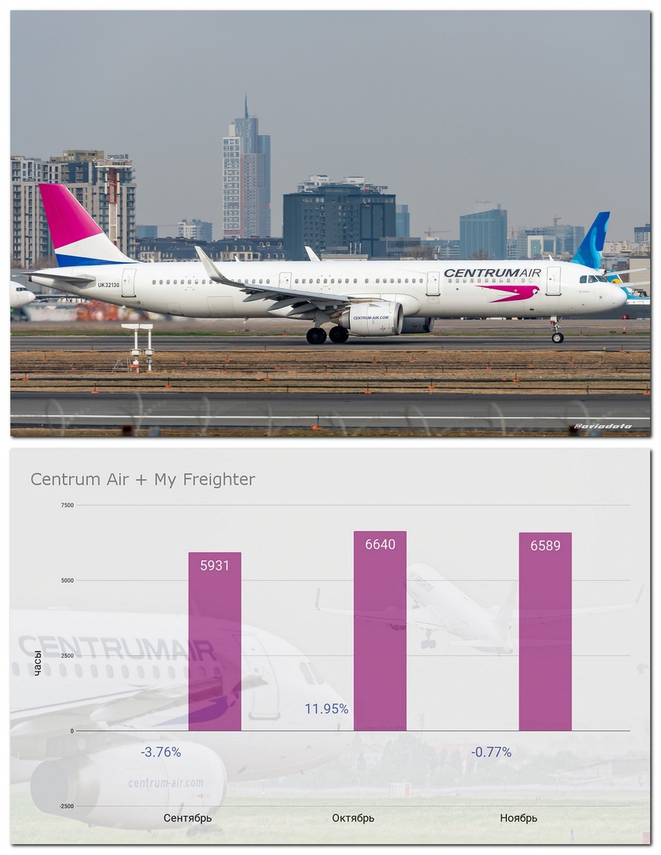 Итоги ноября: Centrum Air + My Freighter В ноябре приступил к полётам Airbus A320 UK32076. В работе было 12 самолётов из 13. Общий налёт группы авиакомпаний изменился незначительно. Среднесуточный налёт на одно воздушное судно уменьшился ⬇️ на 2.12% и составил 9.59 часа. Суммарное количество часов налёта воздушных судов авиакомпаний Centrum Air и My Freighter за ноябрь уменьшилось 🔽 на 0.77% по сравнению с октябрём и составило 6589 часов. Общая динамика за последние 3 месяца представлена на графике. #статистика #centrumair #myfreighter #ноябрь2025