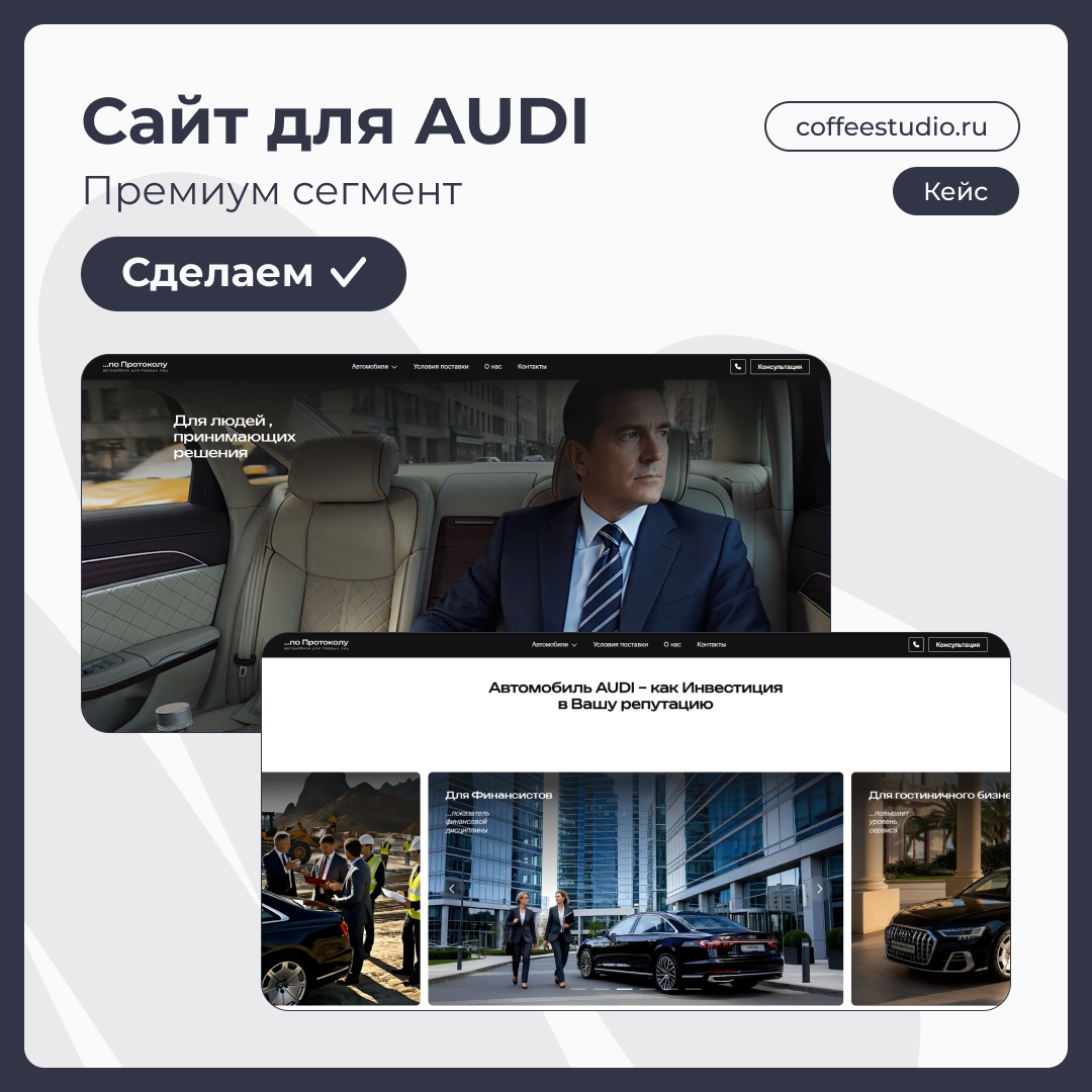 Клиент Клиент, специализирующийся на поставках представительских седанов Audi корпоративным клиентам, обратился к нам с задачей по разработке сайта. Задача Для запуска рекламной компании команде CoffeeStudio необходимо было за месяц создать посадочный сайт с большим количеством интерактивных анимаций для продажи монобрендовых представительских автомобилей. Контекст Клиент развивает новое направление бизнеса по легальным поставкам в Россию представительских седанов Audi стоимостью выше 20 млн рублей: модели Audi A8L Flagship и особая удлиненная версия Audi A8 XL Horch. Это не массмаркет, каждый товар — штучный. Поэтому требовалось сделать не просто интернет-витрину, а прежде всего коммуникационный сайт, который будет ориентирован на определенную узкую когорту представителей крупного бизнеса, которые ценят проверенное годами качество элитных немецких авто. Особое внимание клиент уделял позиционированию бренда, эмоциональному вовлечению посетителей, поэтому самостоятельно подготовил пере