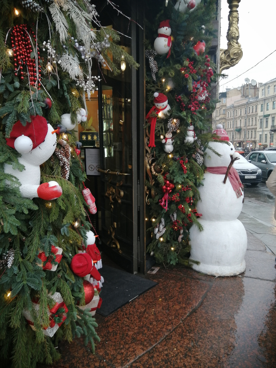 Заметили,что как-то неторопливо украшается наш город к праздникам.Оказывается, разработали правила новогоднего оформления витрин и входных зон. Согласно рекомендациям Смольного, владельцы могут не согласовывать новогоднее оформление витрин и входных групп, если они оформлены в соответствии с новыми правилами,образцы которых прилагаются.А если хочется чего-то особенного,то нужно согласовывать . Дом Книги очень забавно оформил вход в магазин! Снеговики приветствуют и приглашают! В Гостином Дворе витрины очень красивы,ещё бы,такие роскошные ёлочные игрушки их украшают! А пингвины приглашают в Мороженицу,надо заглянуть ,как время будет! А эта красотка приглашает насладиться шоколадом... Рядом с Гостиным двором уже Дед Мороз стоит,почти со Снегурочкой. А вот ёлка не впечатлила совсем... Снеговик,правда,для фотосессии очень даже ничего.Но реклама рекламная)). Гости города,не отходя от чемоданов,фотографируются!) Сегодня пошел снег,летел и таял,пока плюсовая температура. Ближе
