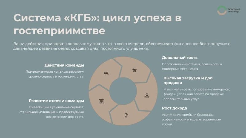 Команда. Гость. Бюджет - система «КГБ» Эта неделя будет посвящена стратегии, которая учитывает интересы трех сторон: ❤️Команда хочет применять свои навыки, быть замотивированной и вовлеченной. ❤️Гость хочет комфорт, сервис и впечатления. ❤️Бюджет требует контроля над доходами, расходами и эффективностью. Действия всей команды напрямую влияют на то, чтобы гость остался довольным. Если гость доволен, то, как результат - это спрос на дополнительные услуги, рекомендация друзьям, возвратность, положительные отзывы. То есть и доход растет, благодаря эффективности команды и удовлетворенности гостей. Система «КГБ» - это стратегический цикл, который напоминает, что нельзя оптимизировать бюджет, игнорируя команду и гостя. И нельзя бесконечно требовать от команды энтузиазма, не давая ей развития и не связывая ее усилия с общим успехом.