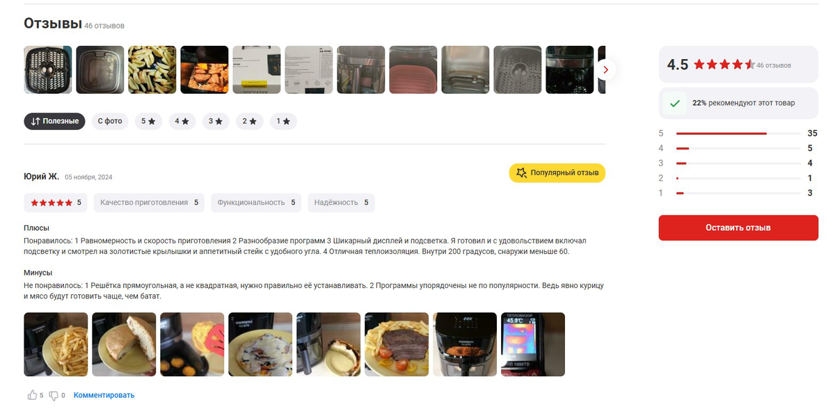 Представим, пользователь выбирает аэрогриль. Описания на большинстве сайтов идентичны, поэтому решающим становится раздел с отзывами.