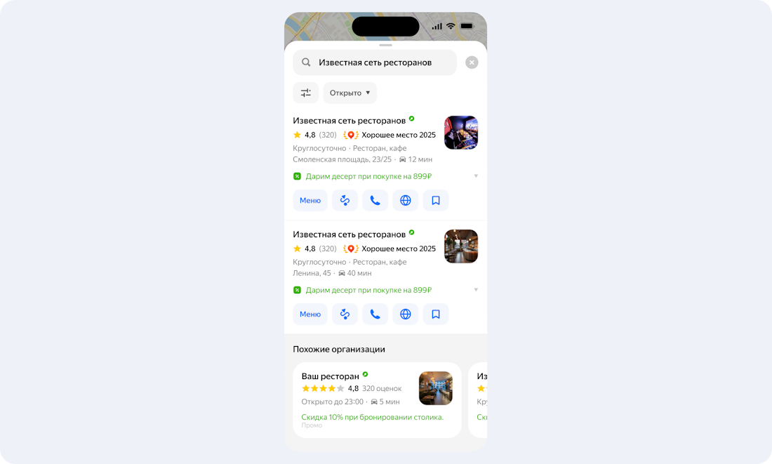 Яндекс Карты запустили открытое бета-тестирование нового рекламного формата – «Похожие организации». Теперь бизнесы могут продвигаться по брендовым запросам – когда пользователь ищет компанию по названию, в выдаче может отобразиться карусель с другими организациями, подходящими по категории и локации. Одна из задач Яндекс Карт – дать рекомендации, которые не только помогут с поиском и выбором организации, но и позволят решить задачу пользователя. Когда люди вводят в поиск название компании, они часто ищут не конкретную организацию, а решение своей задачи: вводят название грузинского ресторана, но рассматривают грузинскую кухню; ищут название знакомого ателье, но хотят быстро подшить одежду. «Похожие организации» расширяют выбор и помогают пользователю быстрее достичь своей цели, даже если запрос начинается с названия компании, – говорится в сообщении Яндекс Рекламы. Эксперимент Яндекса показал, что каждый шестой переход из карусели «Похожие организации» приводит к целевому действию. Ка