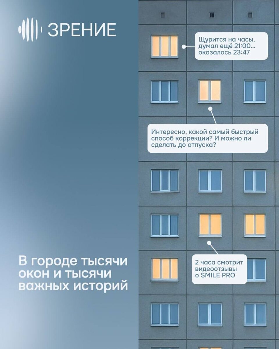 За каждым окном горит своя история Мысли, планы, сомнения. Кто-то откладывает визит к врачу уже несколько месяцев. Кто-то снова листает отзывы о коррекции зрения до глубокой ночи. А кто-то устал каждый день искать очки по всей квартире. Листайте карточки ➡️ Возможно, где-то там ваша история. Или история того, кто живет рядом.