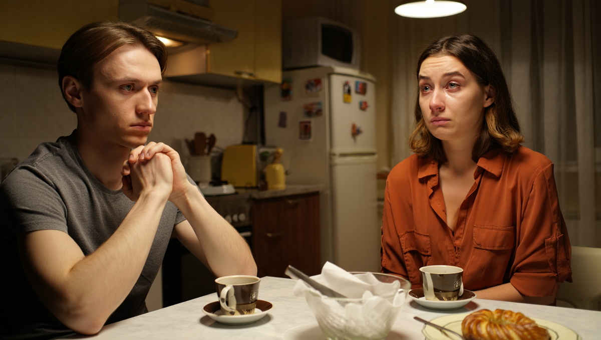 Наконец, когда до свадьбы осталось две недели, Максим приехал. Я открыла дверь и увидела его осунувшееся лицо, тёмные круги под глазами. Мы сели на кухне, и он долго молчал, глядя в чашку с чаем.
