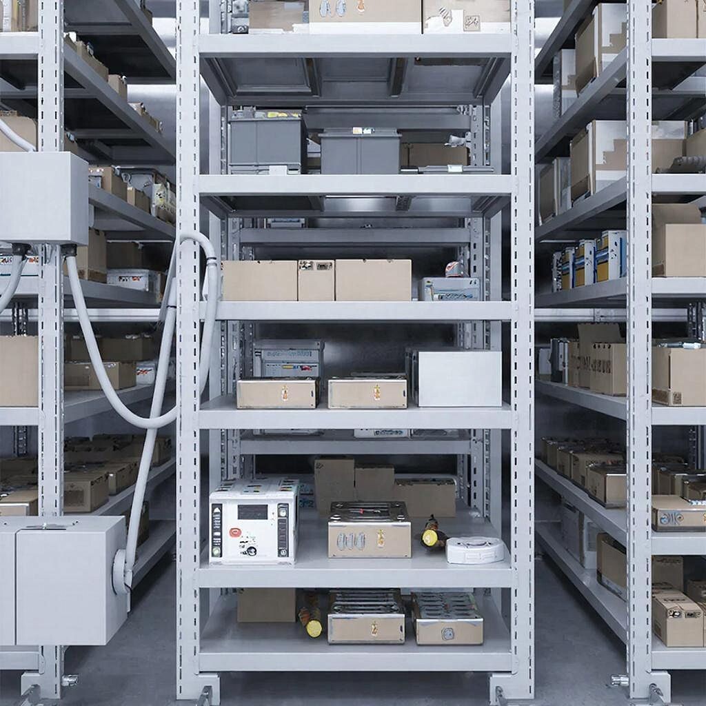 На складе удобно использовать стеллажи с разделениями по типам и напряжениям. Полка должна быть: