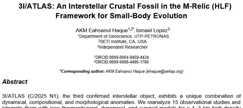 Согласно их анализу, 3I/ATLAS это не обычная комета или астероид, а возможно, искусственный зонд инопланетной цивилизации, скрытый под "никелевым плащом" - специальной маскировкой. Они основываются на свежей научной статье от 1 декабря 2025 года "3I/ATLAS: межзвёздный ископаемый реликт в рамках модели M-Relic (HLF) эволюции малых тел", но интерпретируют данные по-своему, добавляя элементы, которые официальная наука может игнорировать.