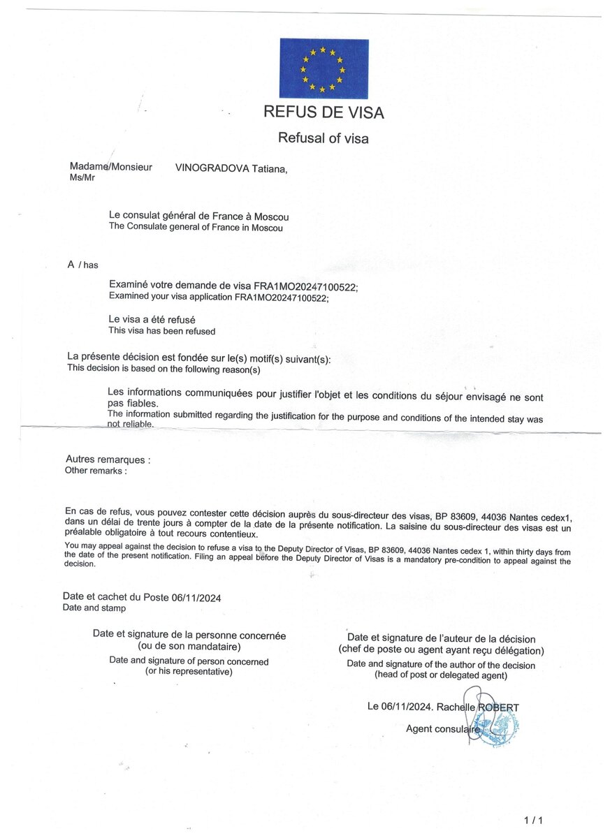 в следующей статье я расскажу причины отказа в визе. Собственно прикрепляю как выглядит отказ в французской визе