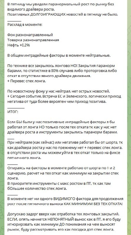 🆘 В рамках обучения читаем план на день из закрытого ТГ канала, план на день прописывается ДО начала сессии. ❗️Работали От ШОРТА опираясь на оценку общей ситуации, технику и интраденые факторы. ЧИТАЙТЕ ПЛАН НА ДЕНЬ! _____________ Расчет был простой и логический. В рамках интрадея я опираюсь только на факты в моменте и не использую догадки. В Пятницу был не совсем понятный вынос, стороить догадки на чем был рост и продолжится ли он в понедельник нет ни какого смысла тк как это 50 на 50. Из пятничной сессии самое главное на что мы обращаем внимание это перевес спек лонга и самое главное это "слепой" лонг, те спекулянты не понимая причин роста просто в моменте присоединяются к тренду, тк как это "слепой" лонг, рост без видимого повода то и оценить потенциал движения ни как нельзя. Сегодня ДО начала сессии расклад был следующий: За выходные не вышло ни каких новостей и не появился тот драйвер роста который гнал рынок в верх в пятницу, поэтому мы просто держим в уме на возможное продол