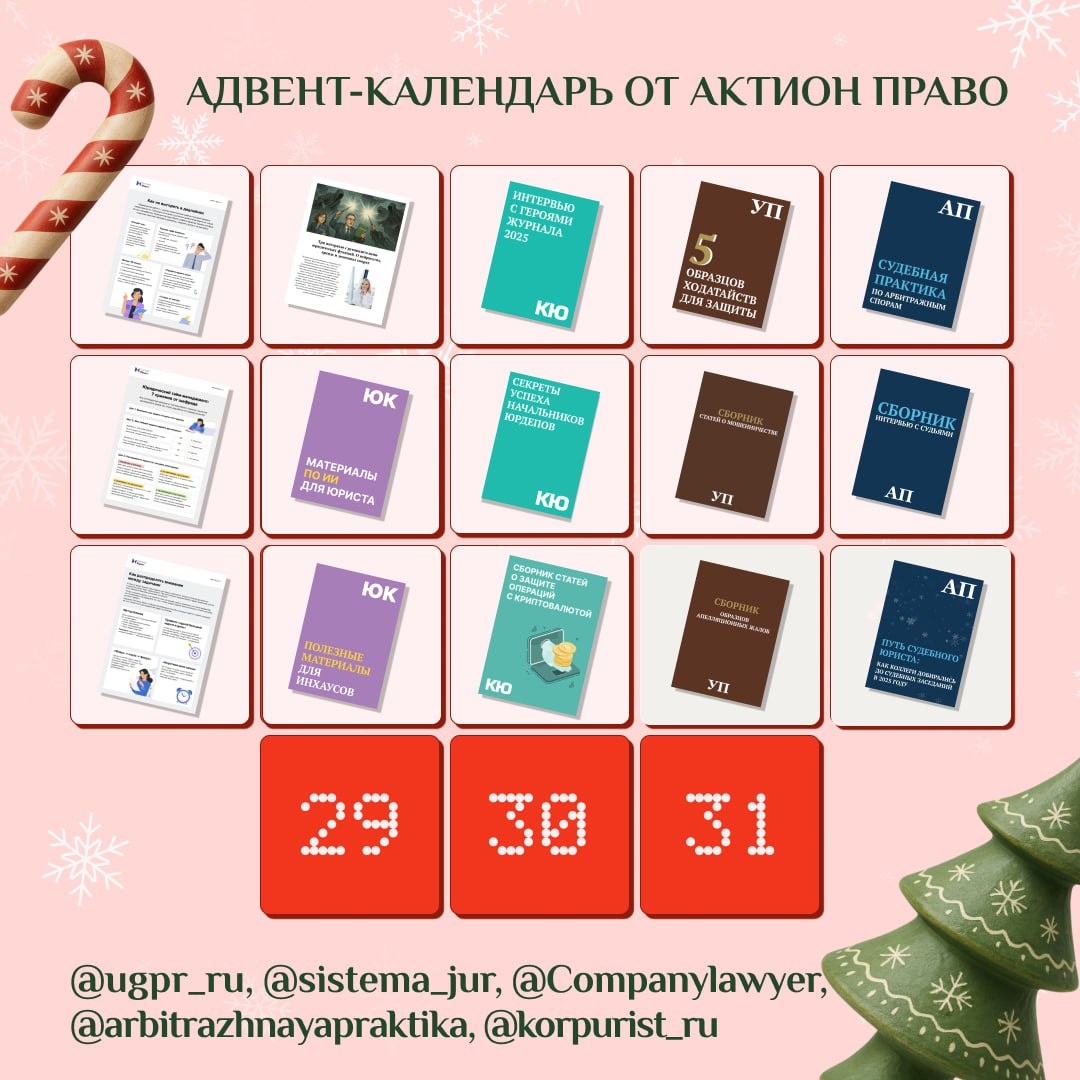 До Нового года осталось всего три недели, и мы решили провести их особенно приятно и полезно. С сегодняшнего дня в наших телеграм-каналах мы запускаем адвент-календарь 🎁 Тот самый, где каждый день открываешь новое окошко — и внутри уже ждёт подарок. Каждый день вас будет ждать новый полезный материал от редакции. Его можно сохранить, переслать коллегам и использовать в работе. Следите за постами в наших телеграм-каналах, открывайте новое окошко адвент-календаря и забирайте подарки каждый день до Нового года 🎄 Чтобы точно ничего не пропустить, сохраняйте себе папку с нашими телеграм-каналами. Так все подарки будут у вас под рукой. Вы можете скачать 12 подарков! Подписывайтесь на все каналы, чтобы не пропустить. ⚪ первый подарок: памятка «Как не выгореть в дедлайнах». ⚪ второй подарок: сборник интервью с руководителями юридических функций. ⚪ третий подарок: сборник интервью с героями журнала «Корпоративный юрист». ⚪ четвертый подарок: сборник из пяти образцов ходатайств для з