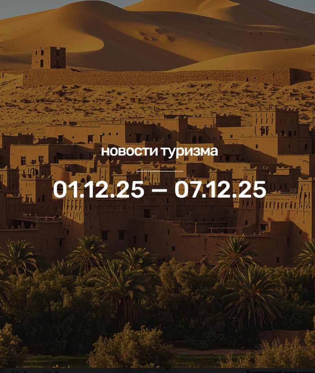 Рассказываем, что произошло в мире туризма за неделю: с 1 по 7 декабря 🔥 ГЛАВНОЕ: ВИЗЫ, ПРАВИЛА, БЕЗОПАСНОСТЬ • В Египте планируется повышение стоимости визы для туристов с 25 $ до 45 $ • Египет ждёт рекордный рост туризма в 2025 году • Россия отменила визы для туристов из Китая до 14 сентября 2026 года на взаимной основе • Путин и Моди после переговоров объявят о масштабных планах сотрудничества России и Индии ✈️ НОВЫЕ НАПРАВЛЕНИЯ: КУДА ТЕПЕРЬ МОЖНО УЛЕТЕТЬ И УЕХАТЬ • Cambodia Airways с 22 декабря запускает рейсы из Владивостока в Макао • Jazeera Airways с 25 декабря открывает рейсы из Кувейта в Сочи • Gulf Air со 2 марта 2026 года переводит свои рейсы в Шереметьево 🎉 КУДА СХОДИТЬ: ФЕСТИВАЛИ И СОБЫТИЯ • Dubai Shopping Festival пройдёт в ОАЭ с 5 декабря по 11 января. Запланированы большие скидки, концерты, фейерверки • 6 января 2026 года российская эстрадная певица Полина Гагарина выступит в отеле Rixos Tersane Istanbul • С 24 по 28 февраля в Санремо (Италия) состоится Фестиваль
