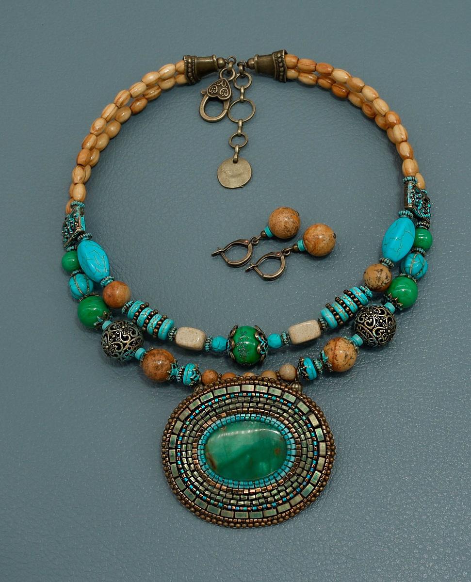 Обалденное колье с натуральной яшмой, турквенитом, стеклом лэмпворк и деревянными бусинами. Кулон расшит дорогим японским бисером, в центре - яшма.