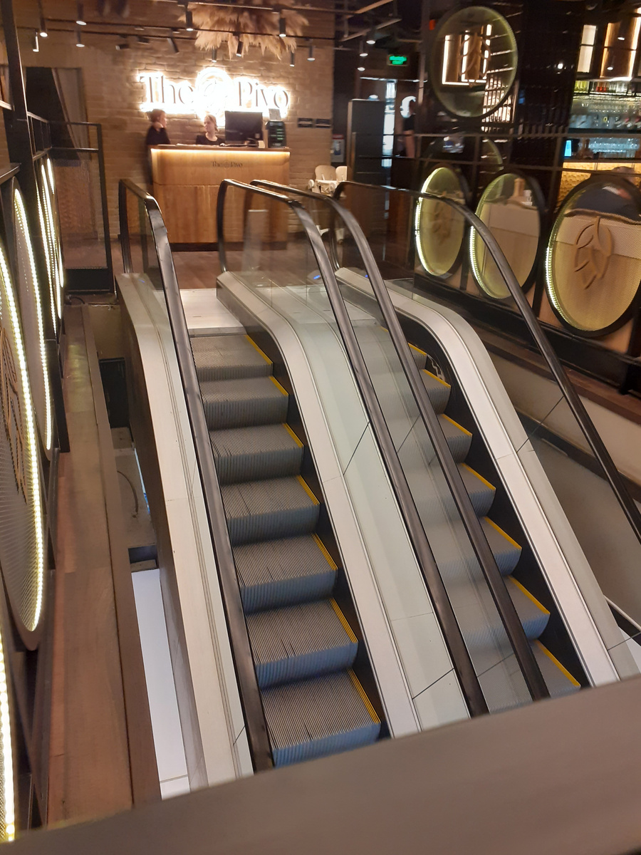 С виду обычный торговый центр, ничто не говорит нам о наличии ресторана внутри. А он занимает почти весь второй этаж. Поднимаемся на эскалаторе. В ресторан. Уже достопримечательность.