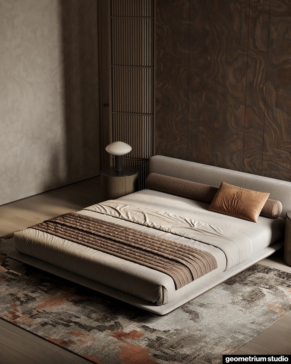 Сегодня заглянем в мастер-блок на первом этаже: спальня и ванная. Спальня выдержана в общей эстетике дома — минимализм, природные оттенки и тёплые древесные текстуры. Свет проникает через большие окна, делая пространство мягким и спокойным. Главный акцент — кровать с развёрнутым деревянным изголовьем из шпона с активным рисунком. Оно работает как красивая декоративная перегородка: отделяет спальную зону от небольшой рабочей — с письменным столом и креслом. Светлый текстиль, ковёр с оттенками терракоты и округлые формы тумб создают атмосферу уюта и гармонии. В мастер-санузле — два вида керамогранита: спокойный фоновый и рельефный акцент у раковины и в душевой. Душевая и унитаз расположены на одном подиуме, а внутри самой душевой мы спрятали встроенные полки и сделали удобную лавочку под тропическим душем. Слева — тумба с большой накладной раковиной, которая создаёт необычную, запоминающуюся композицию. Справа — отдельностоящая ванна, завершающая спокойный ритм пространства. Ещё больше и