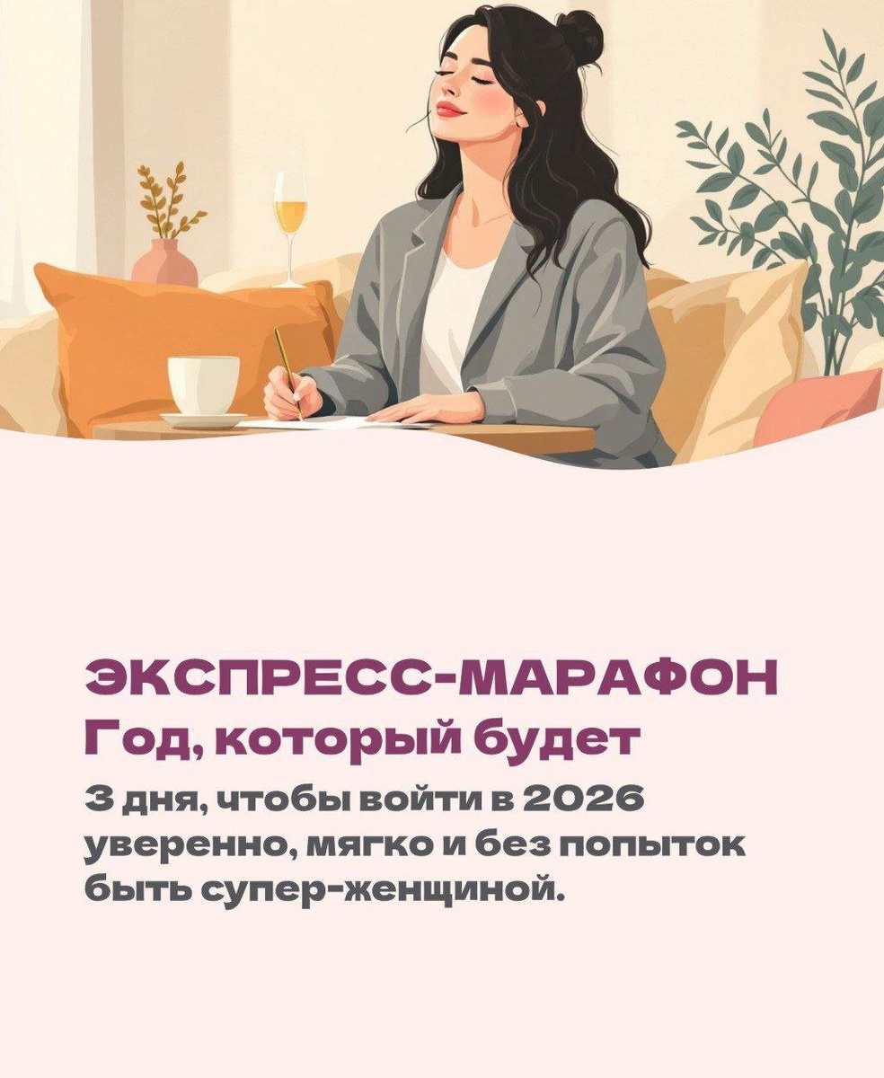 Каждый декабрь одно и то же: ✨Пишешь цели — а потом снова «ничего не изменилось». ✨И внутри уже страх: а если и 2026 пройдёт так же? Хватит тащить прошлое - приходи. Мы мягко закроем этот год внутри, и настроим твой личный маршрут на новый. Это маленькое камерное пространство, где можно выдохнуть, услышать себя и наконец почувствовать, что ты идёшь своим путём. Хочешь начать 2026 спокойно, уверенно и по-настоящему? ✈️Пиши в сообщении: «Хочу в год который будет» Когда: 12-14 декабря Сколько: 1500 рублей Где: закрытый тг канал с заданиями