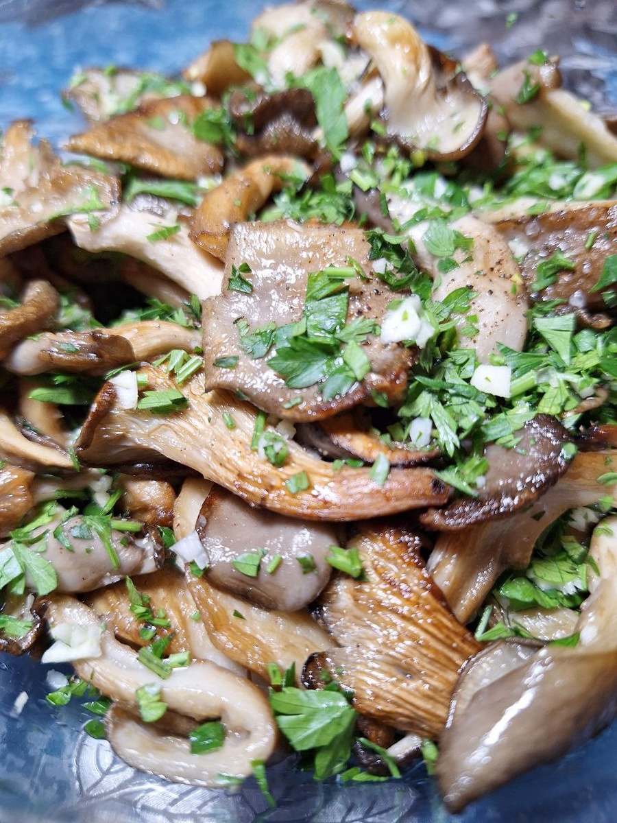 У грибов отрезать твердую часть ножки, вымыть и обсушить. Чеснок и петрушку мелко порубить. Вешенки обжарить на раст.масле с двух сторон до золотистого цвета.Готовые грибы складывать слоями в широкую посуду, еще горячими посыпать солью, перцем, смесью рубленного чеснока и петрушки и сбрызнуть каждый слой уксусом.Можно подавать как в горячем, так и в холодном виде. Приятного аппетита!