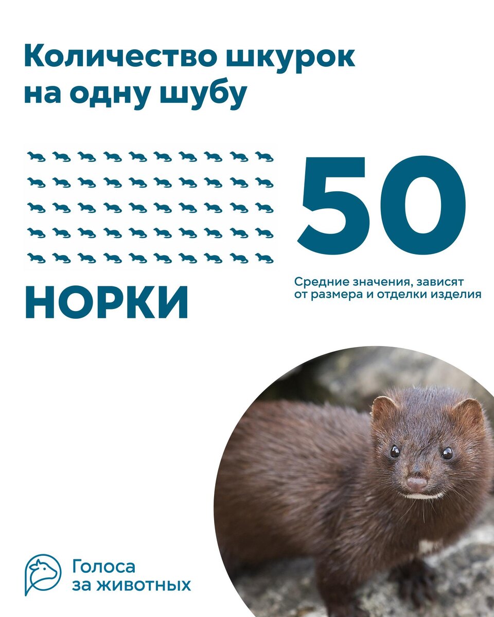 Чтобы сделать, например, шубу, лишают жизни в среднем 70 соболей, 50 норок, 50 хорьков, 15 лисиц или 15 песцов. Но на этом жертвы не заканчиваются. Производство меха — ресурсоёмкий процесс. Для выращивания одной норки на ферме расходуется около 50 кг корма. А чтобы получить всего 1 кг норкового меха, нужно около 11-12 шкурок. Получается, на каждый килограмм меха тратится больше 500 кг корма. А чем кормят этих зверей? Животные из меховой индустрии — хищники. В звероводческой промышленности их рацион по большей части состоит из продуктов, которые тоже получают из животных: рыбы, отходов птицефабрик. Выходит, ради одной шубы страдают не только десятки норок или лисиц. Чтобы их вырастить, нужны тонны корма, а его производство — это отдельная индустрия со своими экологическими последствиями и жертвами. Есть альтернатива. Современные материалы давно доказывают, что можно быть стильным и не мёрзнуть без страданий животных. Каждый раз, отказываясь от меха, вы спасаете жизни и помогаете м