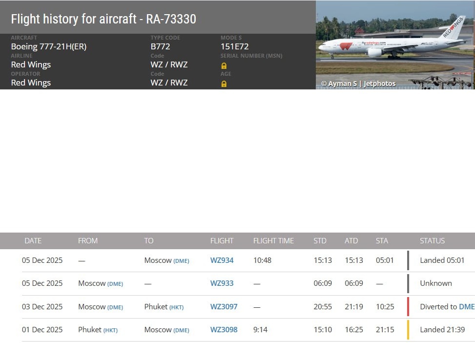 Тот самый Boeing 777 Red Wings с регистрационным номером RA-73330 слетал только во Вьетнам и обратно и три дня стоит в Домодедово