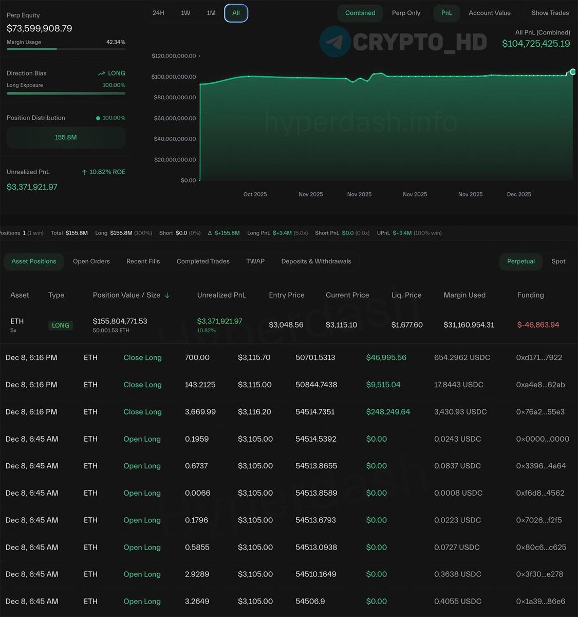 😳 Инсайдер Bitcoin OG вернулся на Hyperliquid…открыл лонг по #ETH с 5х плечом на $155,000,000+ (кошелек
