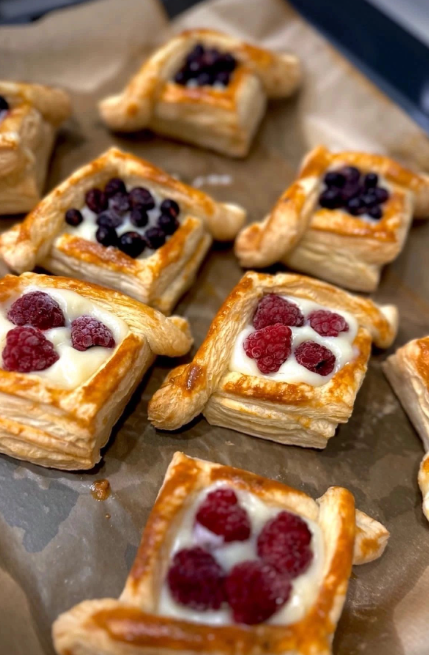 Датские булочки "Даниш" с заварным кремом и ягодами: быстрый ужин из слоёного теста Ищете, что приготовить на ужин быстро, но эффектно? Слоёное тесто — ваш верный помощник! Оно позволяет создавать впечатляющие блюда с минимальными усилиями. Сегодня мы сделаем воздушные датские булочки (даниши) с нежным заварным кремом и яркими ягодами — идеальный баланс легкости и сытности. Почему это отличный ужин: Готовится 30-40 минут Используются доступные ингредиенты Блюдо выглядит как из кондитерской, но требует минимум навыков Сладкий ужин поднимает настроение после долгого дня Рецепт: Даниши с заварным кремом и ягодами Ингредиенты (на 4 порции): 1 упаковка готового слоёного теста (500 г) 200 мл молока 2 яичных желтка + 1 целое яйцо для смазки 3 ст. ложки сахара 2 ст. ложки кукурузного крахмала 1 ч. ложка ванильного экстракта 150 г любых ягод или фруктов (клубника, малина, голубика, персики, яблоки) 1 ст. ложка сахарной пудры для украшения Приготовление: Разморозьте тесто согласно инструкции