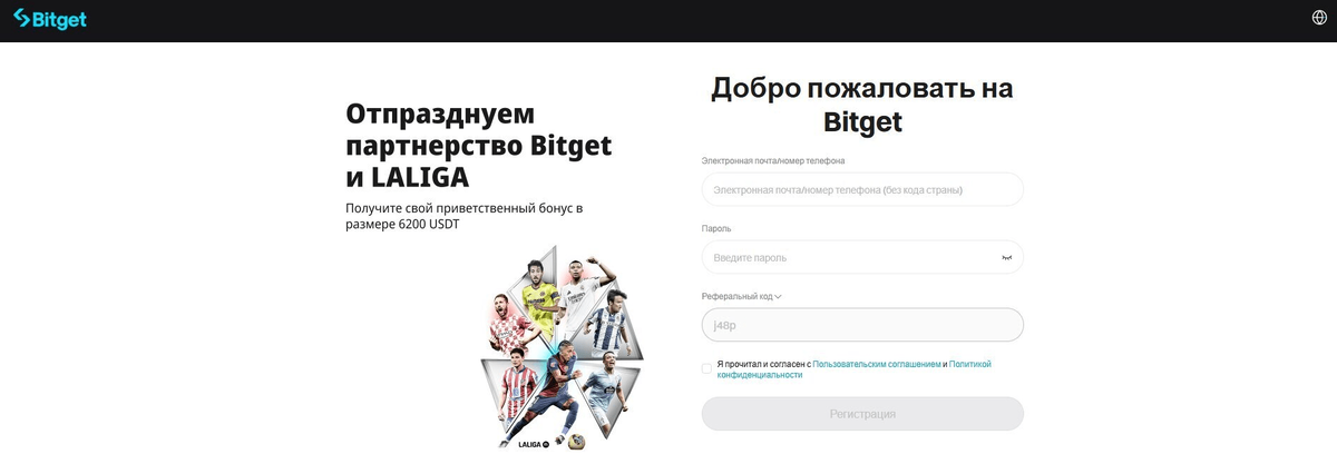 После выбора нажмите «Перейти» и окажетесь на официальном сайте биржи Bitget. На главной странице выберите «Регистрация». Здесь всё предельно простое: вписываете электронную почту или номер телефона, придумываете пароль и подтверждаете согласие с условиями. Сайт биржи Bitget подсказывает каждый шаг — так, будто рядом сидит человек, который объясняет, куда нажать.