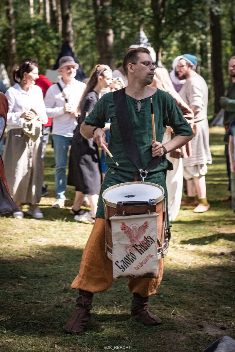 Теперь про барабаны! Чаще всего на выступлениях Фолк-проекта "Слово Князя" встречаются 2 барабана: малый пехотный барабан и довул, - активно дополняя друг друга. Малый пехотный барабан — это вид малого барабана с двумя мембранами на низком цилиндре, который отличается характерным сухим, рокочущим звуком благодаря струнам (подструннику), натянутым под нижней мембраной. Струны создают дребезжащий эффект (снейр-эффект), которые можно отключить с помощью рычажка. Замечали, когда их отключают или подключают во время игры? Удары по ободу могут использоваться, чтоб задать ритм или во время игры солирующего инструмента. И зрелищное и впечатляющее - вращение и подкидывание палочек! Тем самым, этот барабан уникален по количеству извлекаемых звуков. Как зовут барабанщика? #инструменты #музыкасредневековья