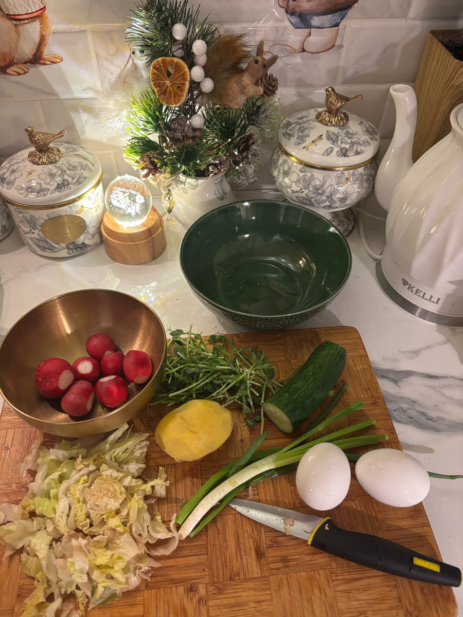 Приветствую всех на моем канале, рада что вы со мной. Хочу предложить вам простой рецепт легкого летнего салата. Салаты - универсальная еда. Их можно делать из всего, что есть под рукой, главное правильно сочетать ингредиенты. Об истории салатов мы поговорим в другом посте, если вам будет интересно. Этот салат очень похож на рецепт для окрошки, и содержит много витаминов и белка. Идеальное сочетание для легкого ужина или как дополнение к основному блюду. Для салата нам понадобится: свежий огурец 1 шт; редис 6-7 шт; 2 яйца; 1-2 отварных картофелины (у меня была запеченная в духовке в фольге); микрозелень горошка; зеленый лук; майонез; 1-2 листа салата айсберг (можно использовать другие салатные листья); соль, перец по вкусу. Микрозелень горошка можно вырастить самостоятельно на подоконнике из семян. Она очень полезна и обладает интересным, но специфичекским вкусом. Если вам не нравится ее вкус или ее нет под рукой, то просто уберите микрозелень из рецепта. Картофель и яйца предвари