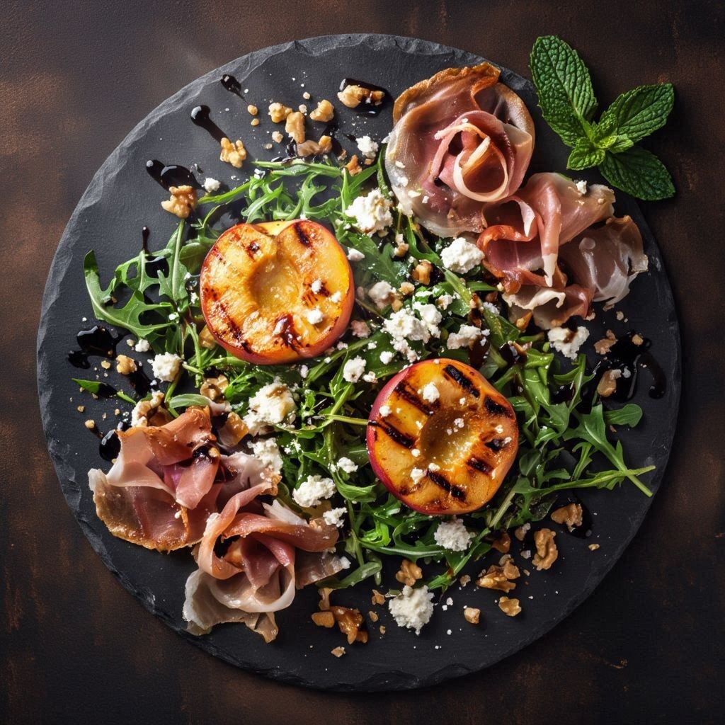 Изысканный теплый салат, где сладость карамелизованных на гриле персиков идеально оттеняется соленой фетой и хрустящим прошутто. Современная интерпретация средиземноморских мотивов.