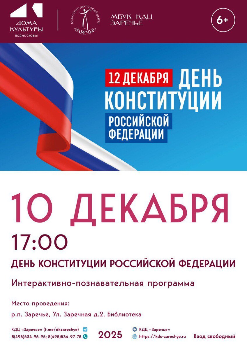 Совсем скоро, 12 декабря, в России отмечается День Конституции Российской Федерации. Конституция РФ была принята всенародным голосованием 12 декабря 1993 года. 🇷🇺 Конституция Российской Федерации является высшим нормативным правовым актом нашей страны, закрепляет основы конституционного строя России, государственное устройство, права и свободы человека и гражданина. Накануне знаковой даты, 10 декабря, приглашаем детей и взрослых на интерактивно-познавательную программу "День Конституции Российской Федерации". Участники мероприятия смогут проверить себя в знании своих прав, закрепленных в Конституции. В наглядной форме обсудим основные положения Главного Закона страны и вехи становления нормативно-правовой базы в разные исторические периоды. 📚 🪶 Начало в 17:00 в библиотеке КДЦ "Заречье". Ждем всех заинтересованных в знании своих прав! #кдцзаречье #культуравзаречье #культура_одинцовскийгородскойокруг #Одинцовскийокруг #ОГО #КультураОГО #ДеньКонституции