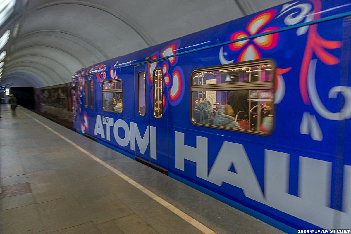 Казалось бы, что может быть общим в этих двух организациях. Нет, понятно, что в культовой писанине «Метро 2033» (достоинства книжонки оставим за скобками) атом и метрополитен пересекаются достаточно плотно. Хотя здесь не тот случай совсем. Может быть, кто-то подумал о поезде метро на атомной (ядерной) тяге? Нет, и тут мимо. Все гораздо банальнее и примитивней (как, впрочем, и основная масса материалов в «Записках»). В общем, дело было так. 1. По своей желтой (Калининской) линии доехал я до конечной Третьяковской, станции, где пересадка между линиями кроссплатформенная. И на соседних путях обнаружил весьма любопытно окрашенный состав, который стоял на линии оранжевой (Калужско-Рижской) линии. Сначала было подумал, что это какой-то фольклорный поезд, но смутила надпись во весь борт – «Атом наш!» Это поезд, который посвящен юбилею корпорации "Росатом". 2. Сфотографировать этот поезд я успел лишь отправляющимся, и уже вдогонку сообразил – это не самый частый поезд в метро: метросостав «Ок