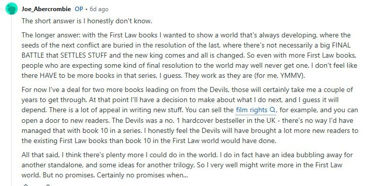 На днях Джо Аберкромби отвечал на вопросы читателей на Reddit, где его в частности спросили о перспективах возвращения в мир Земного круга