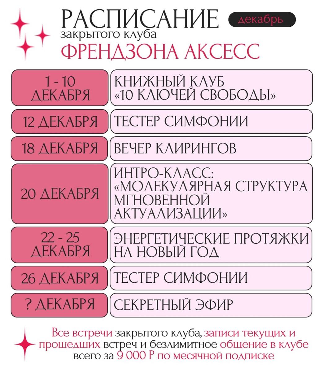 ❤️❤️❤️❤️ ❤️❤️❤️❤️❤️❤️❤️❤️❤️ ❤️ Приглашаем Вас в пространство получения Здесь проходят закрытые встречи с Татьяной: вечера клирингов, тестеры симфонии, книжные клубы, энергетические и денежные протяжки, киноклубы, расширяющие эфиры, подкасты Аксесс ми 📏📏📏📏📏📏📏📏📏📏 ❤️❤️❤️❤️❤️❤️❤️❤️❤️❤️ ❤️❤️❤️❤️❤️❤️❤️ ❤️ 1–10 декабря🌟Книжный клуб «10 ключей свободы» ❤️ 12 декабря🌟Тестер симфонии ❤️ 18 декабря🌟Вечер клирингов ❤️ 20 декабря🌟ИНТРО-КЛАСС только для Френдзоны «Молекулярная структура мгновенной актуализации» ❤️ 22 декабря🌟Энергетические протяжки на Новый год ❤️ 26 декабря🌟Тестер симфонии 🌟Подарок декабря🌟Секретный эфир 📏📏📏📏📏📏📏📏📏 ❤️ По месячной подписке на клуб вы получаете все встречи и все записи уже прошедших мероприятий всего за 9 000₽ ❤️доступ в закрытый клуб • 1 месяц - 9 ООО₽ • 3 месяца - 21 ООО₽ • 6 месяцев - 37 ООО₽ ФРЕНДЗОНА — это пространство продолжать ВЫБИРАТЬ