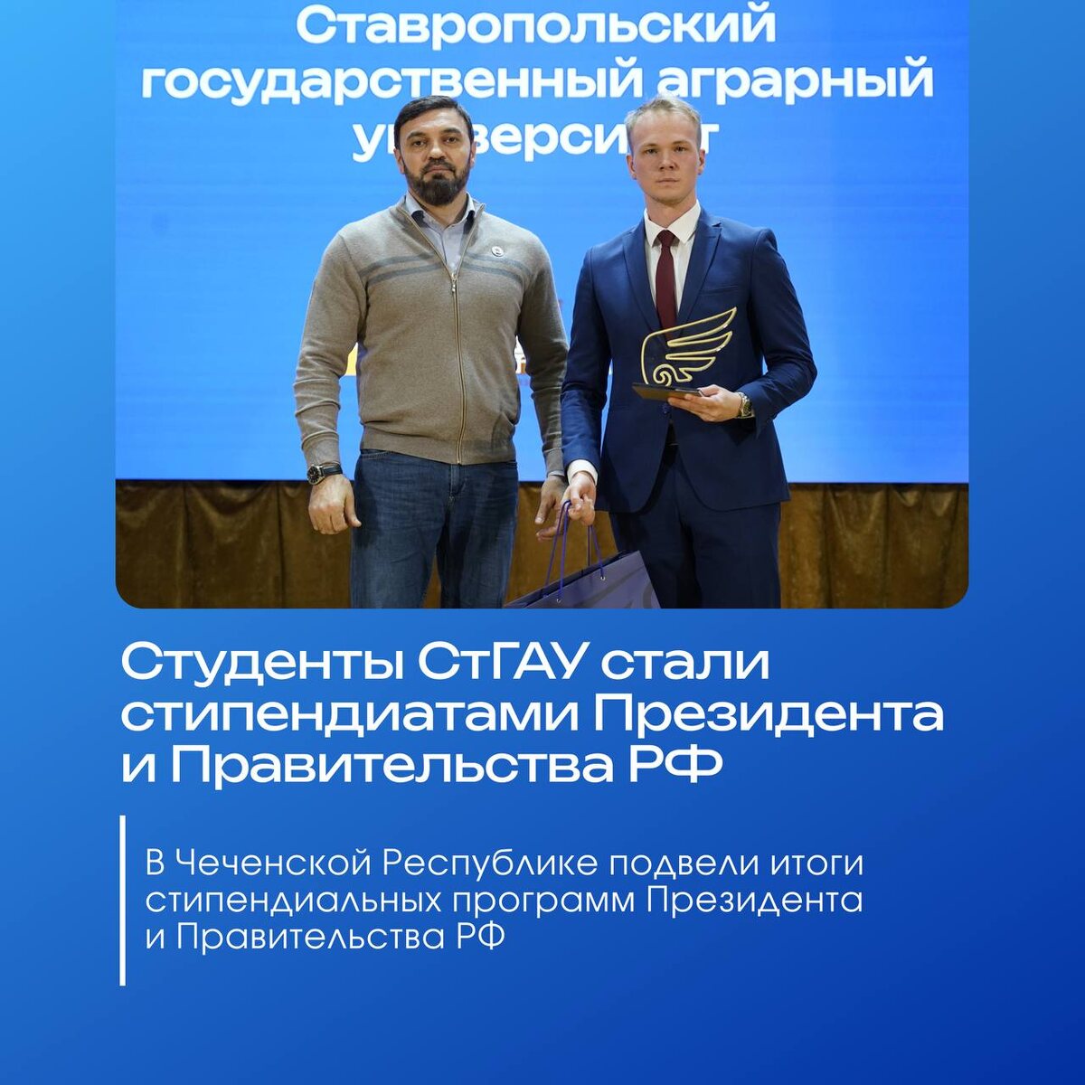 19 студентов СтГАУ получили стипендии Президента и Правительства РФ! 🇷🇺 Торжественный форум по случаю награждения состоялся в ЧГУ им. А. А. Кадырова и объединил более 400 студентов СКФО. 📃 Участники Студенческого научного общества нашего университета достойно проявили себя сразу в нескольких направлениях и получили заслуженные стипендии. Стипендиаты Президента: ▫️«Сельское хозяйство и сельскохозяйственные науки»: · Богдан Бажан · Дмитрий Дрёпа · Виталий Комогоров · Николай Серый · Сергей Сигида ▫️«Инженерное дело, технологии и технические науки»: · Александра Фоменко · Дарья Циндрина Стипендиаты Правительства: ▫️«Сельское хозяйство с сельскохозяйственные науки» · Артём Бояринов · Никита Гапонов · Дмитрий Шестаков ▫️«Инженерное дело, технологии и технические науки» · Илья Васильев · Лидия Нехачева · Михаил Никулин ▫️«Науки об обществе» · Анна Гапонова · Ирина Гомзяк · Анастасия Мартиянова · Никита Мартын · Екатерина Поповская · Виолетта Травкина Ребята ещё раз подтвердили, что н