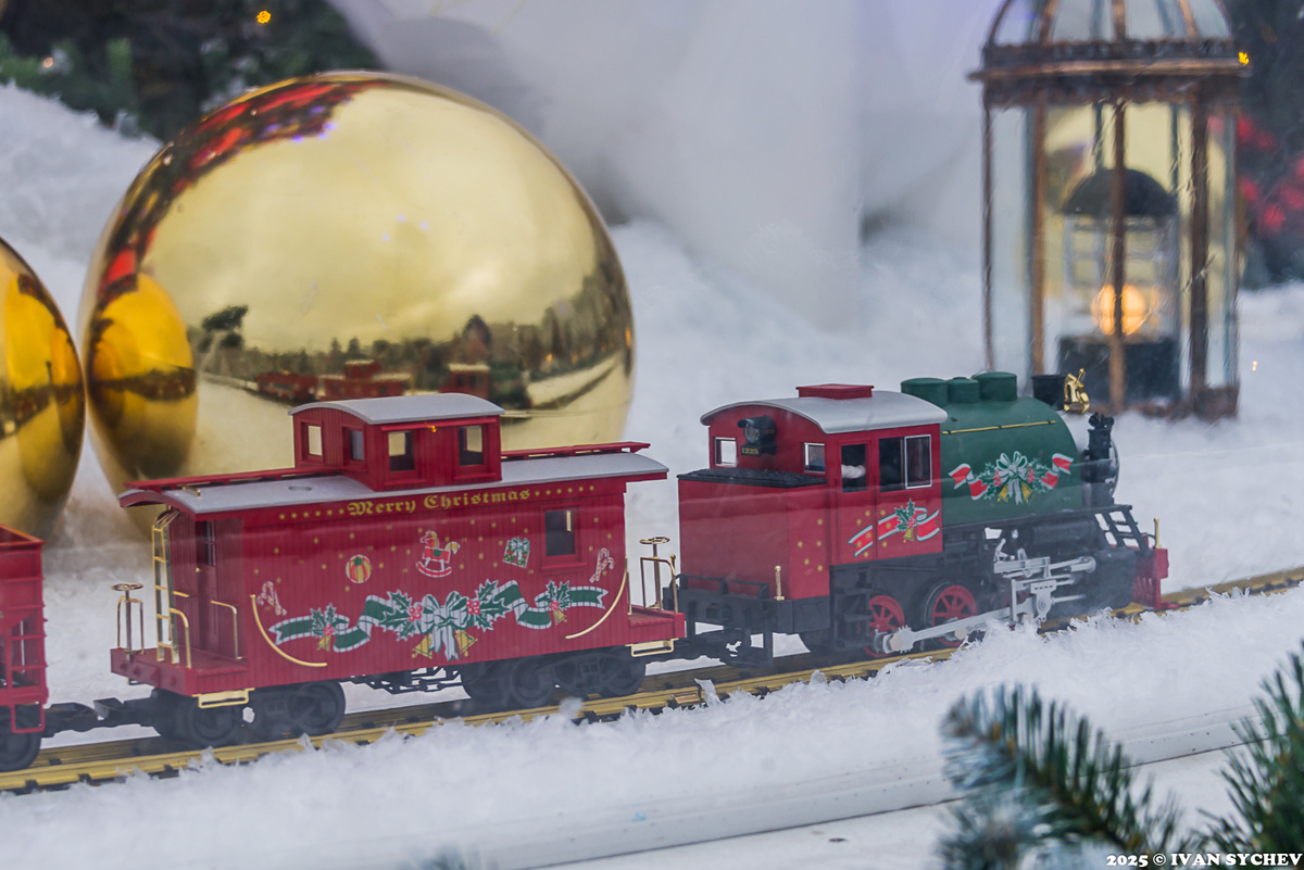 1-4. Сквер уставлен действительно несколькими десятками елок, украшенных игрушками и переливающимися огоньками. А в трех местах среди всего этого стоят три объекта (назовем так), стилизованных под огромные (метров 15 в высоту) шары с искусственным снегом. Внутри них карусель, деревня с белками и в центре – высоченная ель, вокруг которой проложены рельсы и кругами ходит новогодний поезд. Вот его-то я и нашел, сразу и не разглядишь. Плохо только, что пластиковая оболочка «шарика со снегом» несколько мутновата и фотографии получаются не самые удачные. Но я пытался…