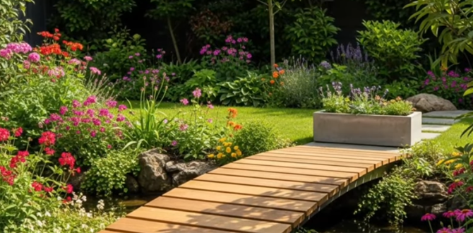 Если уложить их вдоль направления взгляда, дорожка визуально удлиняет пространство и ведёт к уединённому месту: скамейке, беседке, зоне отдыха. Под настилом прячется мягкий источник тёплого света создаётся иллюзия, будто мостик парит в воздухе. Небольшое возвышение защищает корни растений, улучшает дренаж, и одновременно подчёркивает заботу о садовой экосистеме.