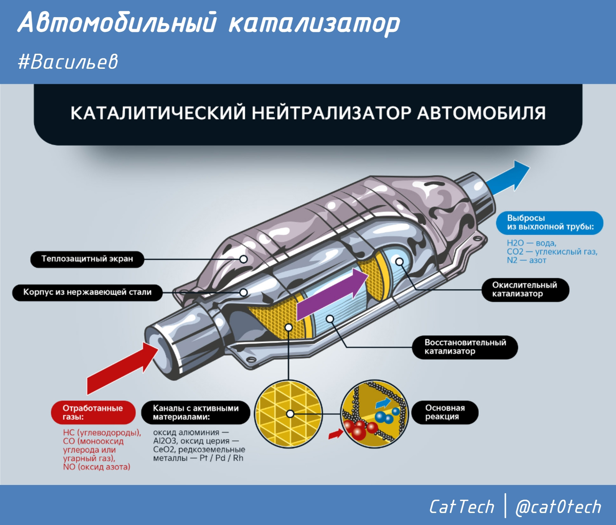 Катализатор... Как много в этом слове, причем не только смыслов, но и денег. Сегодня предлагаю повнимательнее посмотреть на устройство, без которого не обходится ни один современный двигатель, а иногда их ставят даже несколько. Точнее автопроизводители ставят, а вот автолюбители нередко их потом снимают. Правильное название этой запчасти — Каталитический нейтрализатор выхлопных газов, и оно очень точно описывает основную задачу этого прибора. Выхлоп от классического бензинового или дизельного ДВС содержит целую кучу продуктов сгорания топлива, а заодно и несгоревшие остатки, попадание которых в атмосферу, мягко говоря, не желательно. В основном это угарный газ, оксид азота и различные углеводороды, очень неприятные вещи для всего, что может их вдохнуть, а значит надо как-то от них избавляться. Тут нам на помощь должна прийти матушка химия, ведь все эти вещества неплохо друг с другом взаимодействуют, дай им только настояться в какой-нибудь емкости, но вот незадача, топливо сжигается та