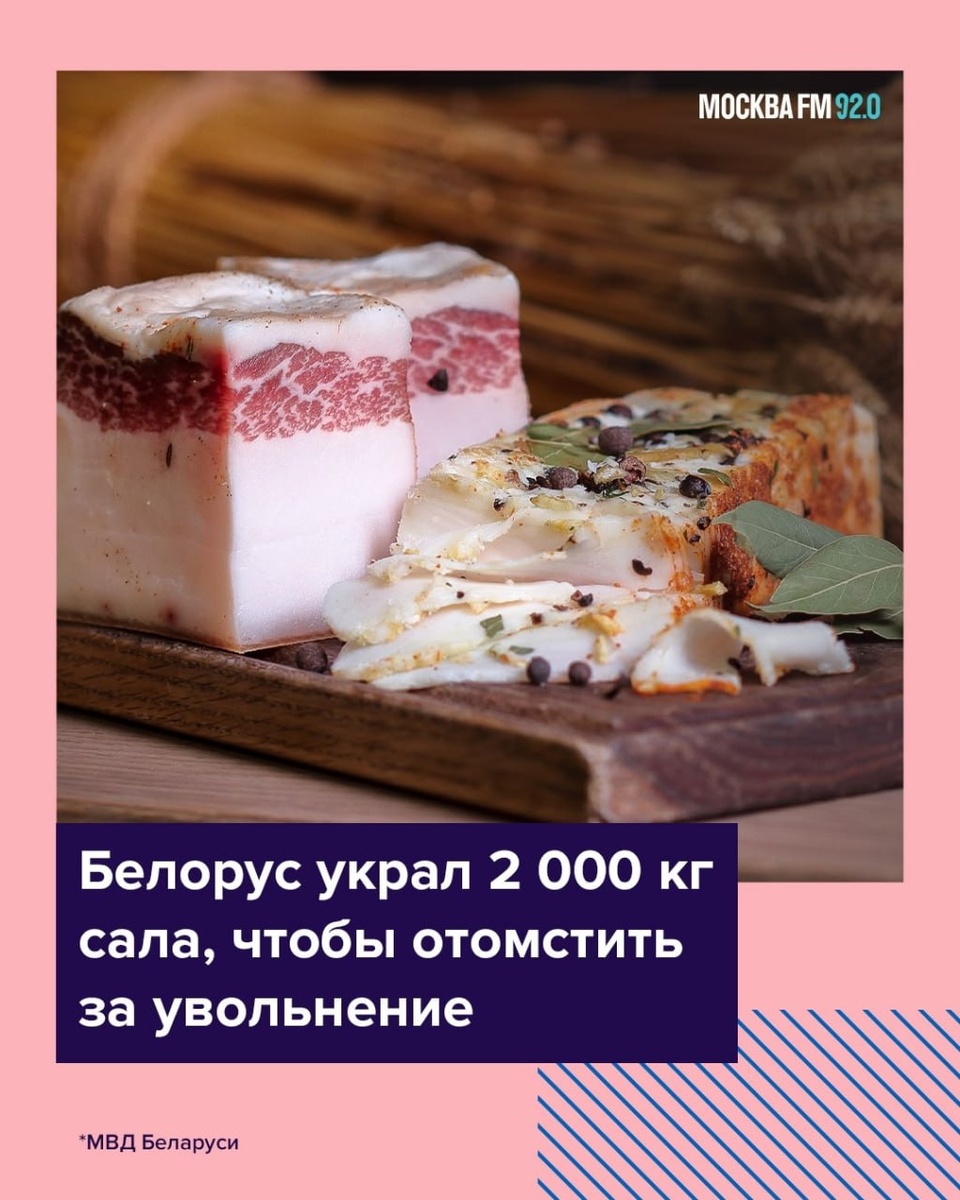 😁 Житель Беларуси похитил две тонны сала в отместку за увольнение В Могилёвском районе 25‑летний предприниматель обратился в правоохранительные органы с заявлением о краже в особо крупном размере. Инцидент произошёл после того, как бизнесмен уволил своего 22‑летнего знакомого — тот решил отомстить за потерю работы. Уволенный мужчина под предлогом забора личных вещей проник на территорию предприятия и вывез две тонны сала в брикетах. Стоимость похищенного составила около 800 000 рублей. Для владельца всё закончилось хорошо — сало вернули в полном объёме. 📌 Подписаться на Москва FM / Наш чат-бот / Мы в MAX