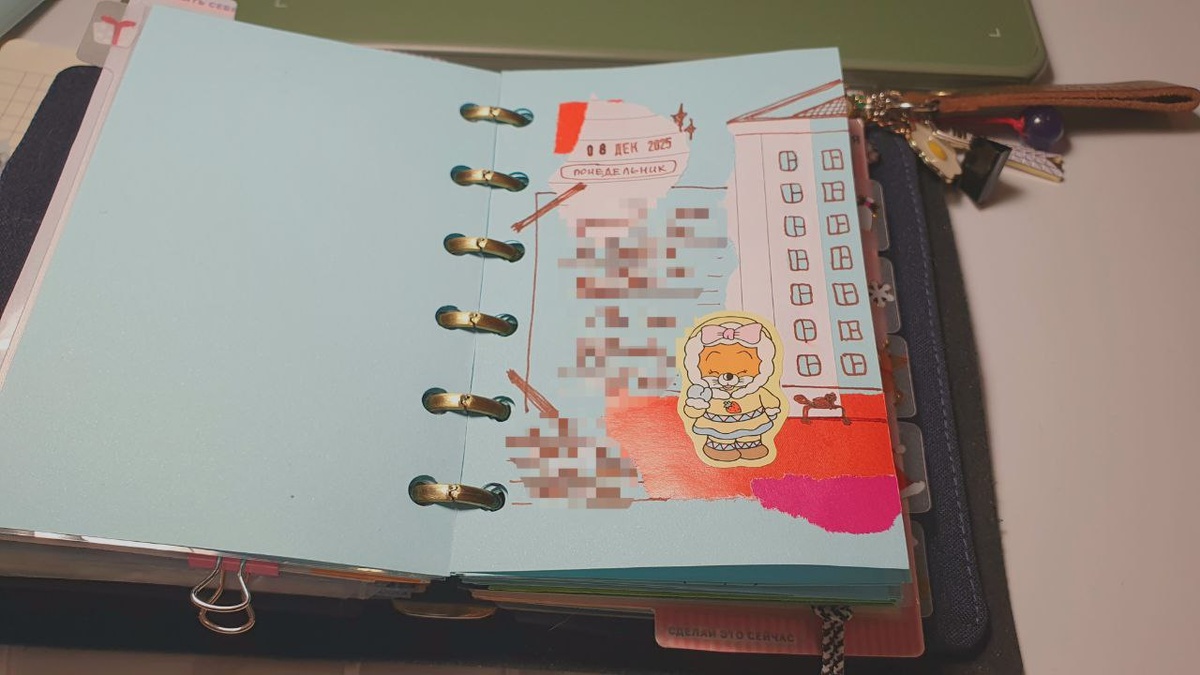Декабрь 2025: делаю коллажи с заметками дня для новогоднего настроения. Системный блокнот Pocket A7 мини 6 колец. Бумага пастельно-голубая, цветная мелованная бумага, стикер лисичка в тулупе и скетч-коллаж новостройки. Сегодня резко похолодало, наконец-то пришла зима. В Казани -12°, ощущается как -17°. Хороший, плодотворный понедельник [дек'8/25] @AnnaBurlachenko