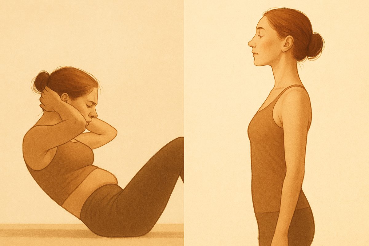 Я долго считала, что красивый живот — это пресс. А потом увидела в зеркале: живот всё равно торчит, а под подбородком появилась складка. И это при том, что я честно делала скручивания каждый день. 1. Скручивания делают живот больше Когда ты поднимаешь корпус и «складываешься» пополам, живот напрягается сверху — а внутри всё начинает выпирать. Почему живот после пресса выглядит больше: ты давишь брюшину вниз; живот напрягается только снаружи; корпус всё время тянется вперёд; появляется эффект «домиком». Внешне это очень похоже на то, будто живот «распирает». 2. Упражнения на пресс дают складку под подбородком Во время скручиваний голова почти всегда уходит вперёд.