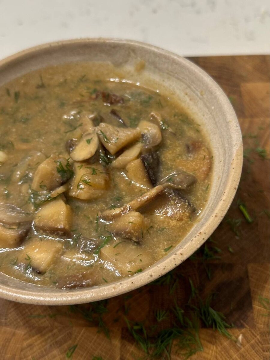 Традиционный венгерский грибной суп готовится на основе куриного бульона, муки и молока. В веганских вариантах чаще всего используют кокосовое молоко или молоко из кешью, чтобы сохранить сливочность, а для густоты так же оставляют муку, но заменяют на нутовую, сорго или рисовую Я решила немного иным путем пойти, добавив больше полезность, но так же сохранить шелковистую текстуру супа ▫️ Грибы -600 грамм (у меня коричные шампиньоны, шиитаки и сушеные белые). Чем ароматнее грибы, тем вкуснее будет суп ▫️Репчатый лук - 1 крупная луковица ▫️Цветная капуста - небольшой вилок ▫️Укроп - 2-3 столовые ложки ▫️Кокосовые аминокислоты или соевый соус 2 ст.л. ▫️Лимонный сок - 1 ст. л. ▫️Паприка - 2 ч.л. ▫️Овощной бульон - 3 стакана ▫️Масло 2 ст л Цветную капусту сварить и взбить в пюре, нам нужно будет 2 стакана пюре В кастрюле обжарить лук до золотистого цвета, добавить грибы, порезанные ломтиками. Обжаривать минут 7-8 Влить бульон, пюре, укроп и паприку. Готовить на медленн